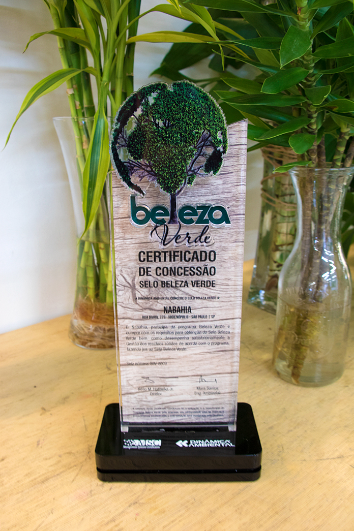 O Programa Beleza Verde, desenvolvido pela Dinâmica Ambiental — empresa especialista em engenharia reversa e gestão de resíduos ­ — trabalha o conceito de gerenciamento em que produtos e serviços devem incorporar, de forma integrada, aspectos sociais, econômicos e ambientais. O salão Na Bahia aderiu à ação em abril de 2018 e, em outubro, recebeu o primeiro selo Beleza Verde (Bronze), que reconhece o cumprimento de medidas colaborativas à preservação ambiental e o comprometimento com a área. “ (A adesão ao Programa) veio da necessidade de encontrar uma empresa séria e comprometida com nossos resíduos”, conta a proprietária e gestora do Na Bahia, Ruchelle Crepaldi.